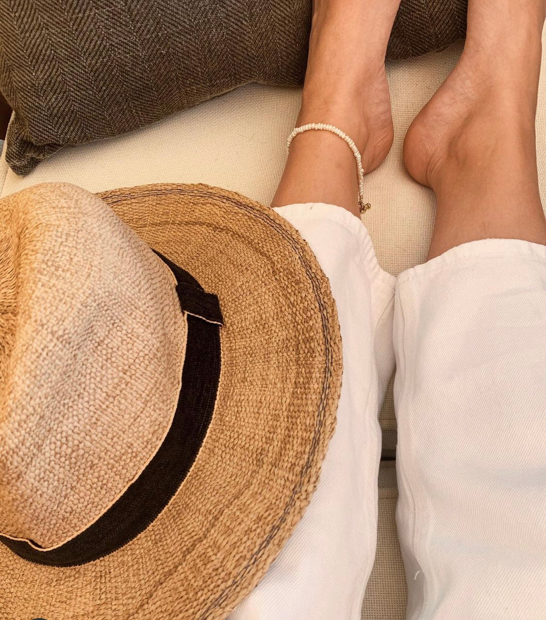 Små hvite barokke ferskvannsperler som omkranser ankelen. Dette er sommerens fineste fotlenke!