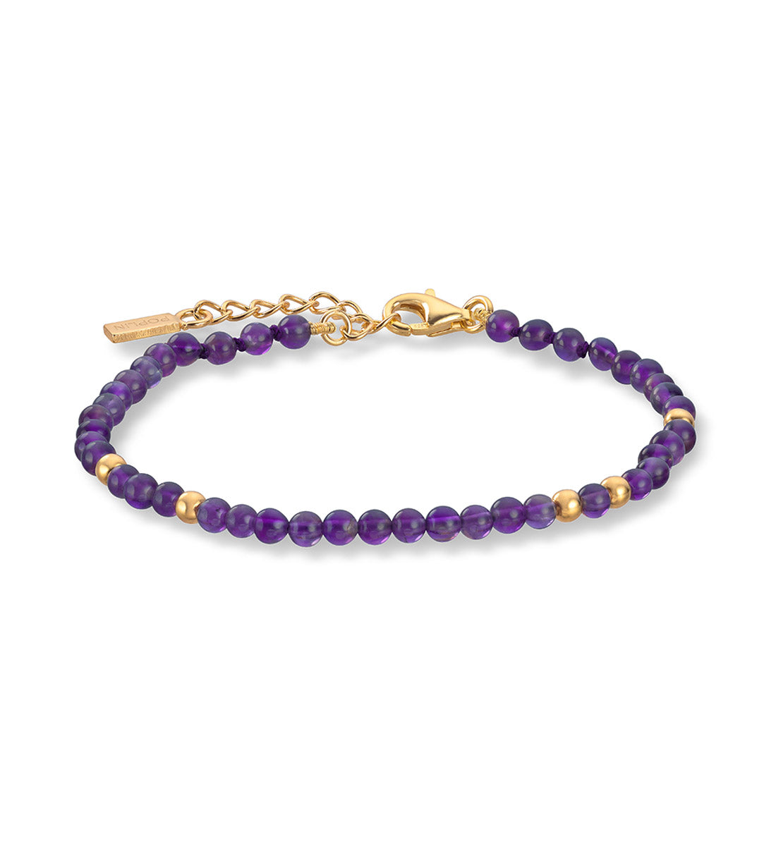 Nydelig armbånd med lilla ametyster og forgylte sølvkuler.